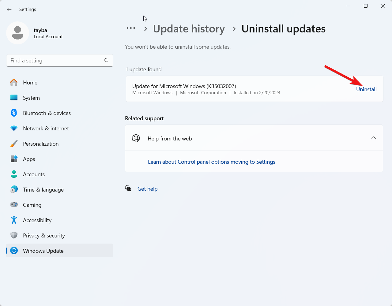 - 查找问题发生时大约同时安装的更新,然后选择“卸载”。