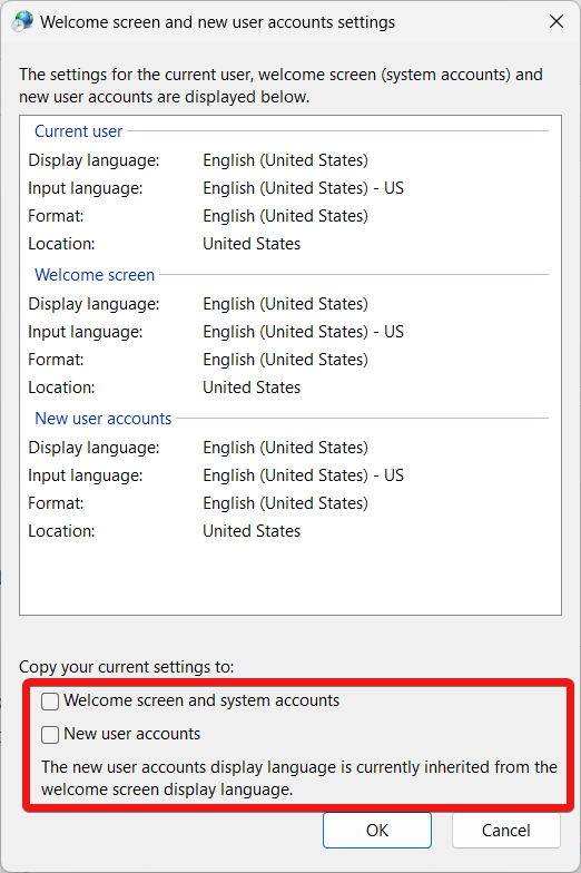 - 在左下角,选中系统、新用户帐户和欢迎屏幕的复选框,然后点击 OK 按钮。