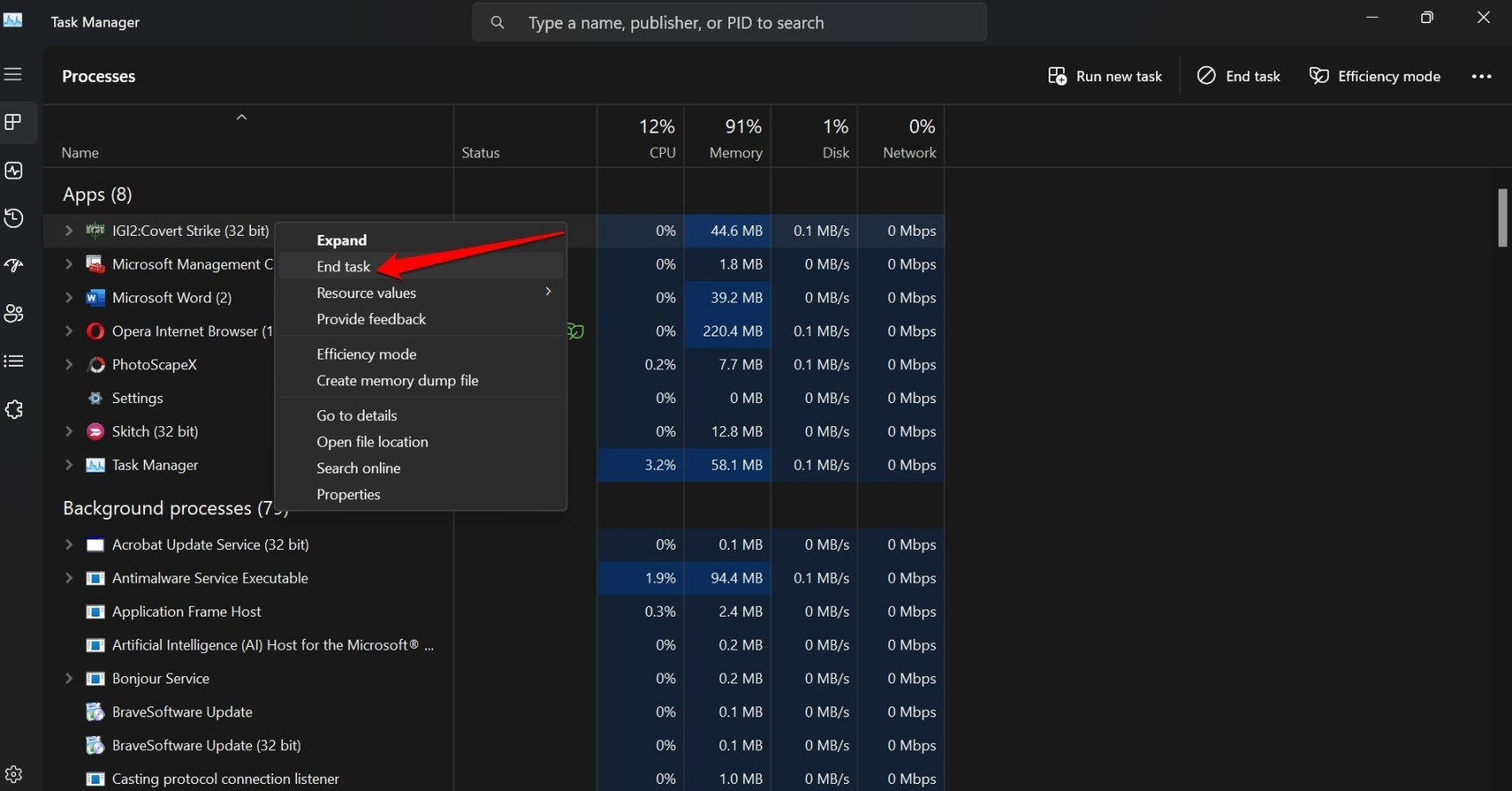 - 右键单击游戏应用程序,然后选择“结束任务”。
