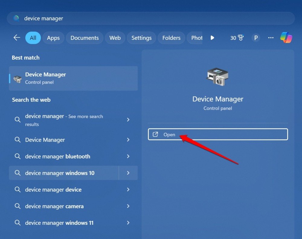 - 键入 Device Manager,然后单击“打开”。