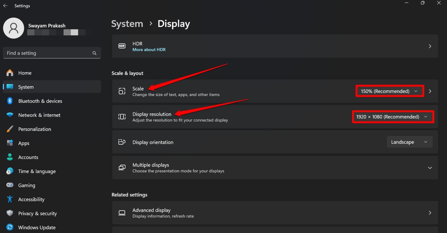 访问 Windows 设置并将显示分辨率和缩放设置为其推荐参数。