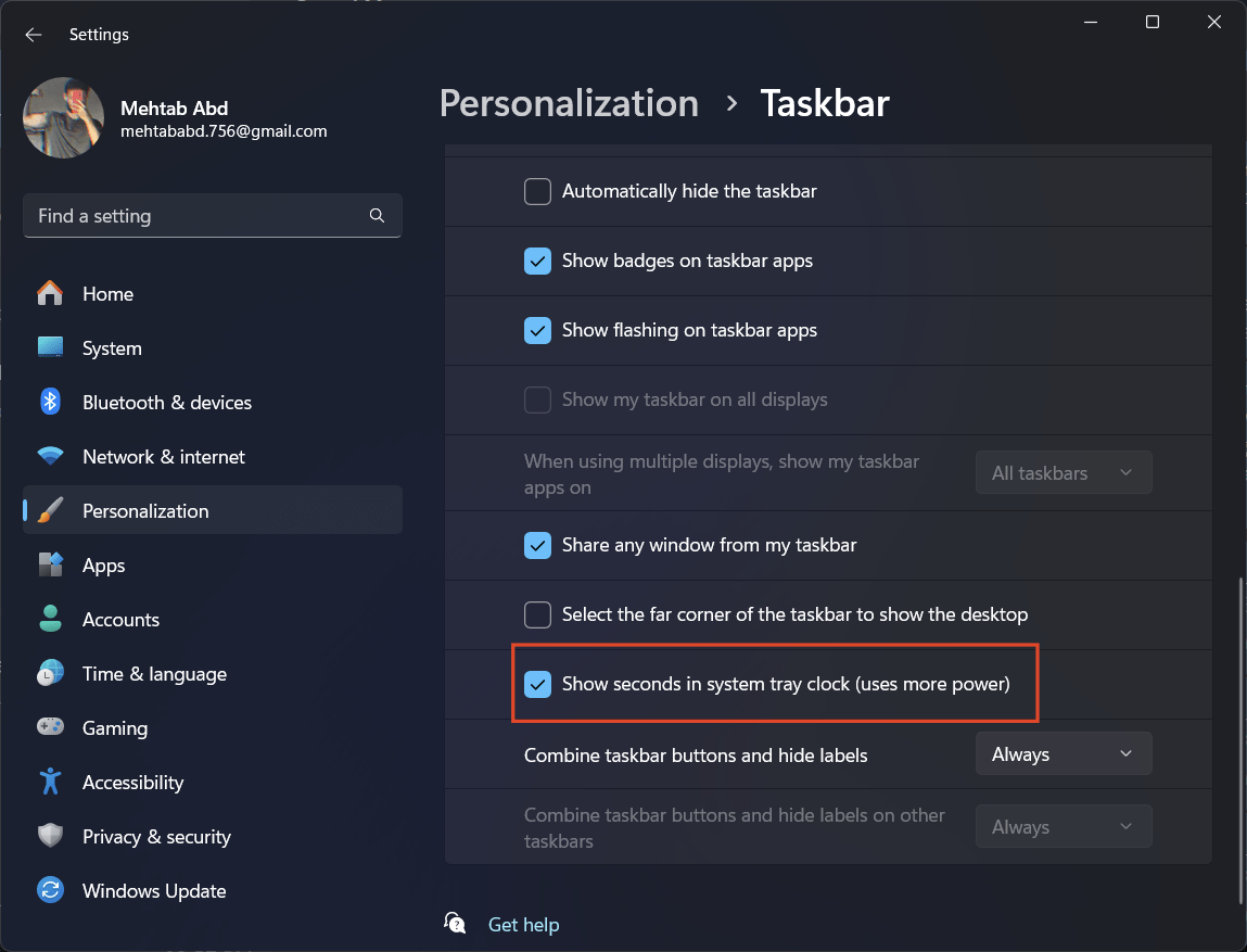 - 向下滚动并选中旁边的框“在系统托盘时钟中显示秒数。”