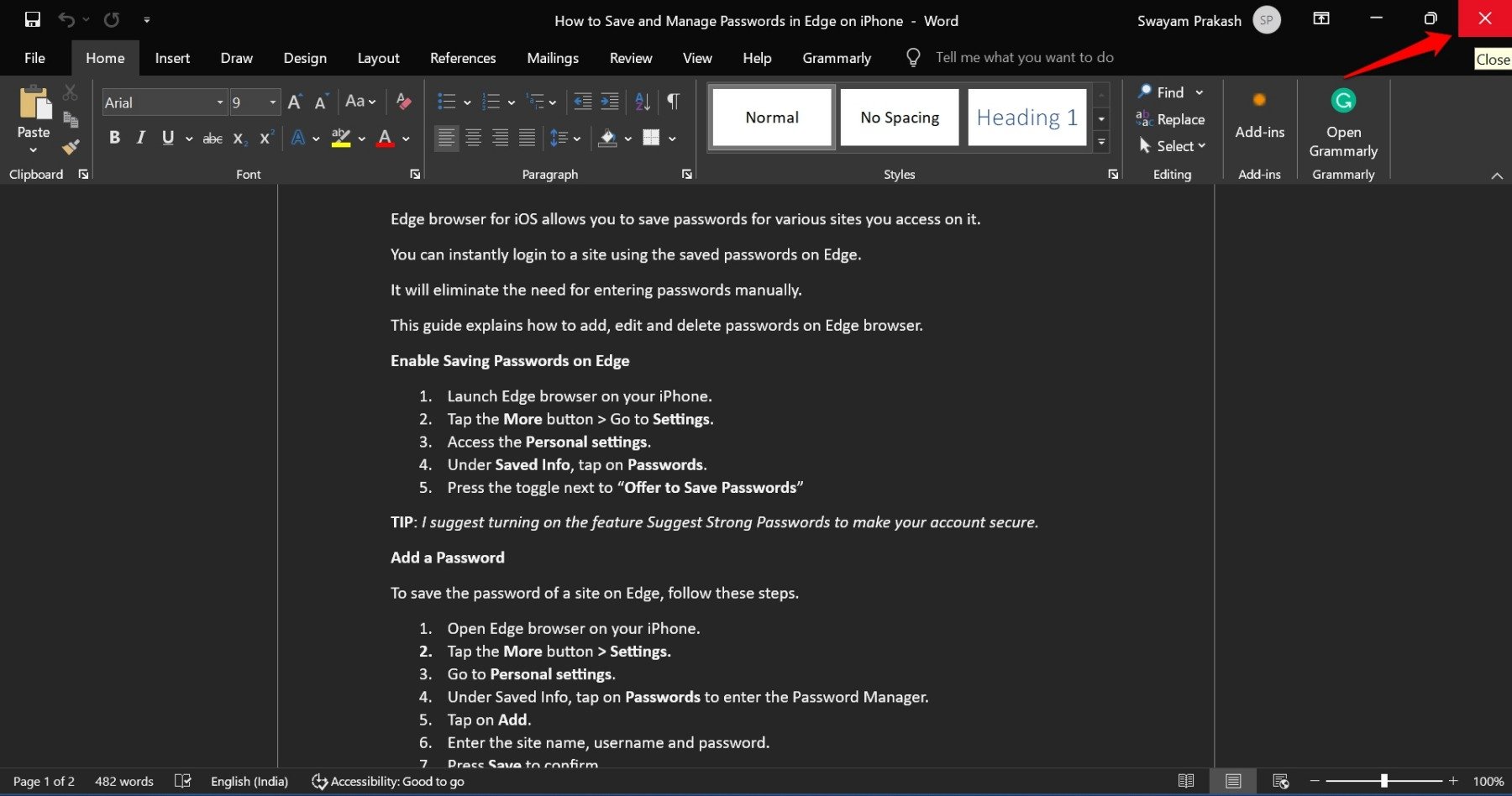 如果无法在两个文件之间复制或粘贴,请在 MS Word 上打开,关闭文件,然后再次打开。或者,您可以从任务管理器关闭应用程序。