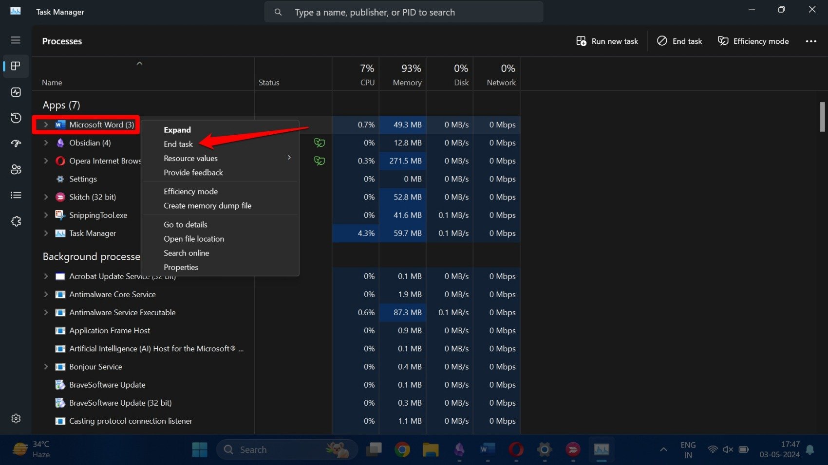 - 滚动到要关闭的程序,单击鼠标右键,然后从菜单中选择“结束任务”。