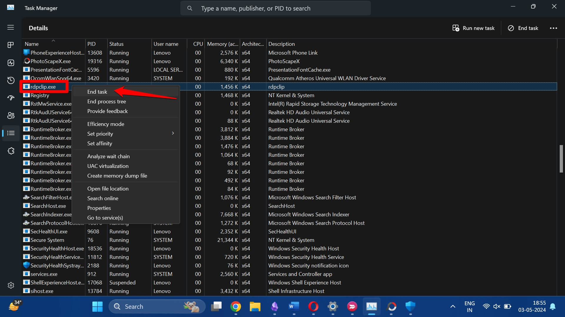 - 右键单击“rdpclip.exe”,然后选择“结束任务”。