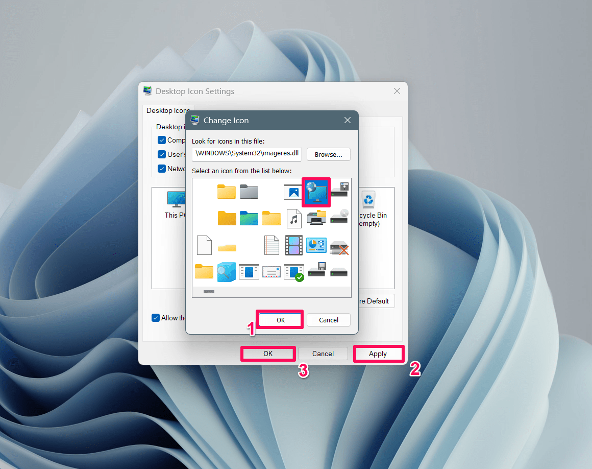 - 选择图标后,单击“确定”按钮,然后单击“应用”,然后再次单击“确定”。
