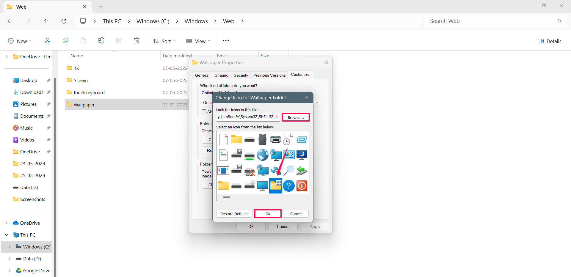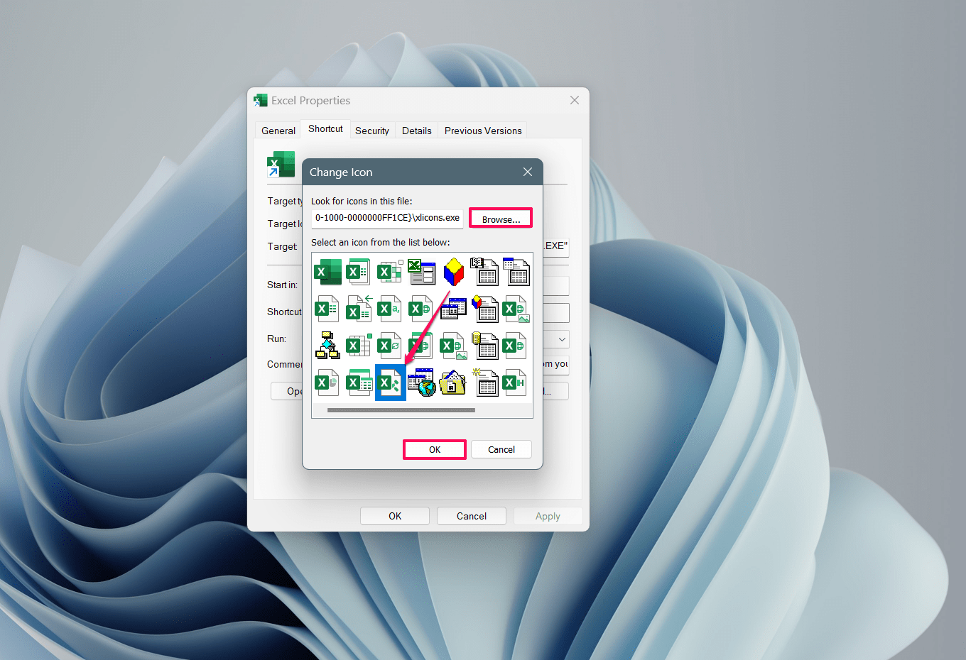 - 在“更改图标”窗口中,选择要为所选图标更改的图标。或者,单击“浏览”选项以选择从第三方源下载的自定义图标。