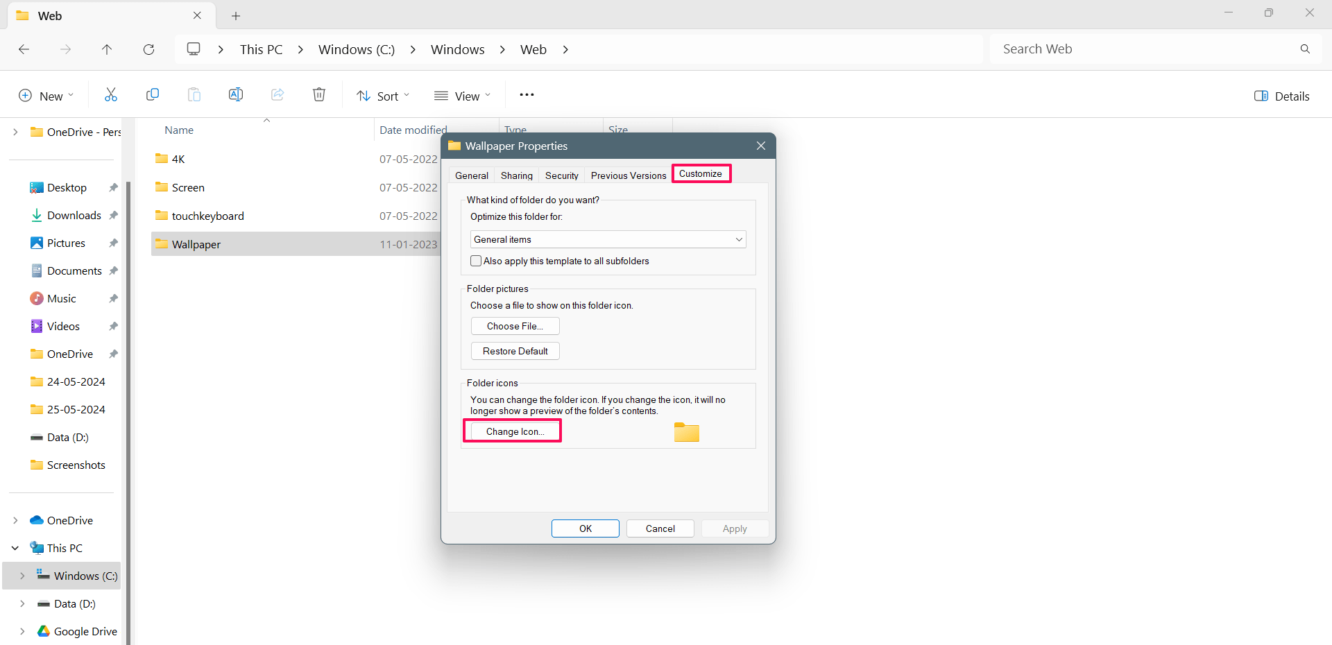 - 在“属性”窗口下,单击“自定义”选项卡。然后,选择更改图标。