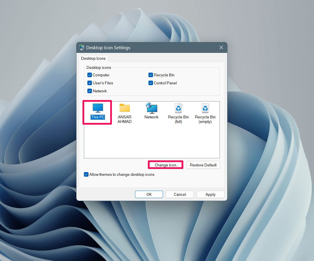 - 选择要修改的桌面图标,然后单击“更改图标”按钮。