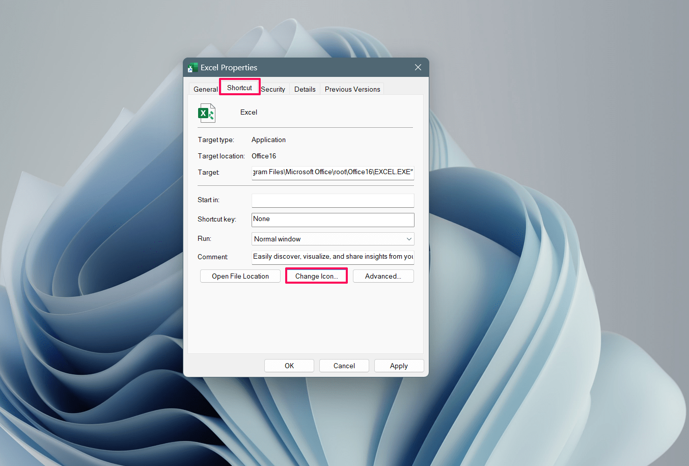 - 在“属性”窗口下,单击“快捷方式”选项卡。然后,单击“更改”图标按钮。