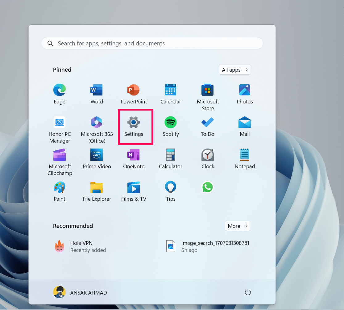 - 按 Windows 图标打开开始菜单,然后单击“设置”应用。