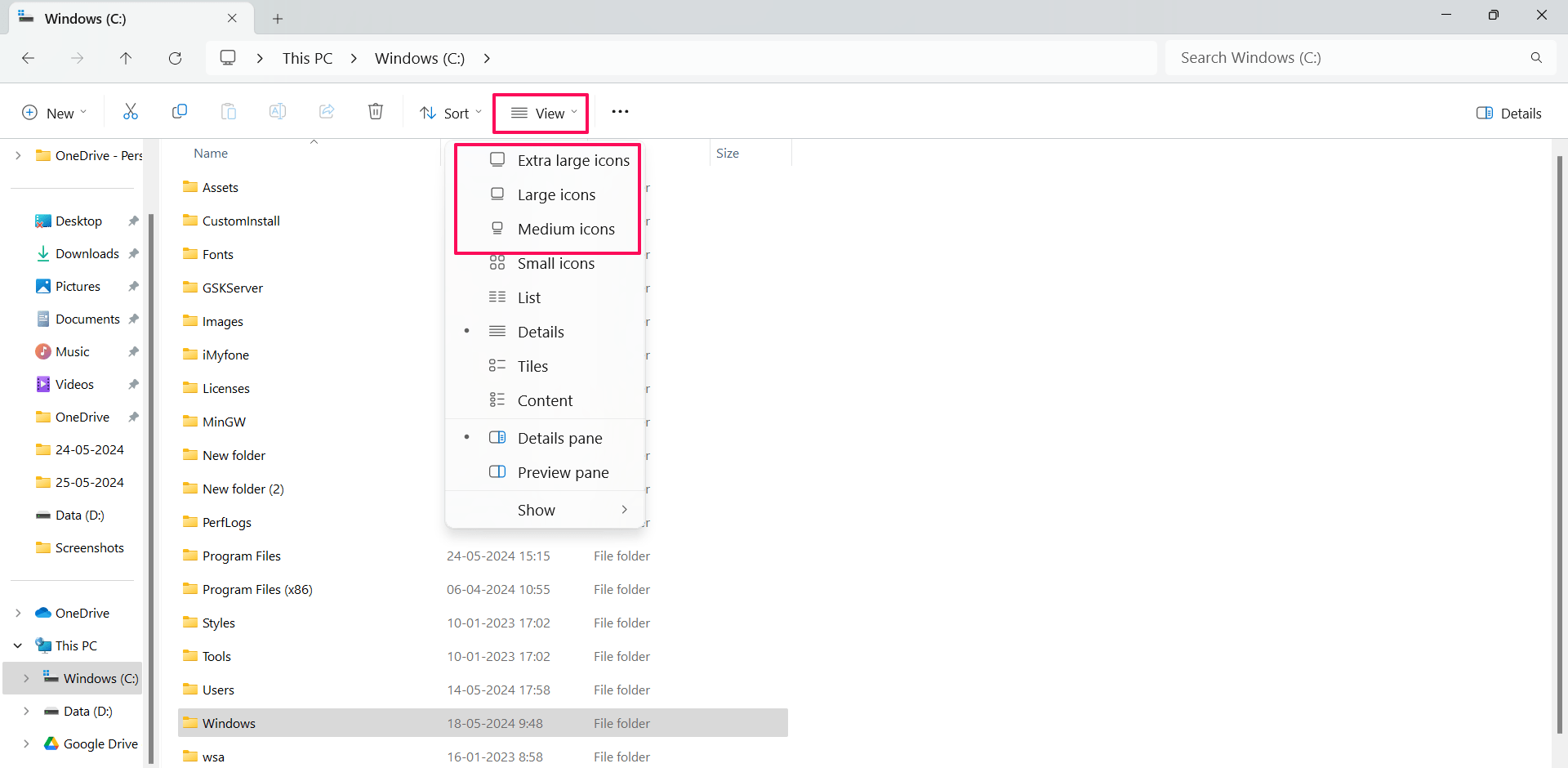 现在,让我们来谈谈文件资源管理器。您可以在文件管理器中更改文件和文件夹图标。您所要做的就是单击顶部的“查看”菜单,然后从可用尺寸中选择尺寸。