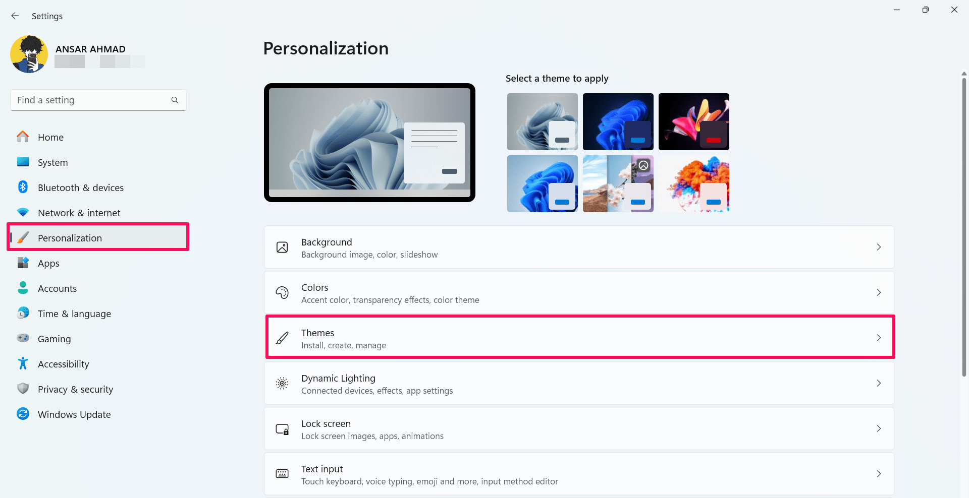 - 单击左侧导航栏上的“个性化”选项卡。然后,单击“主题”选项。
