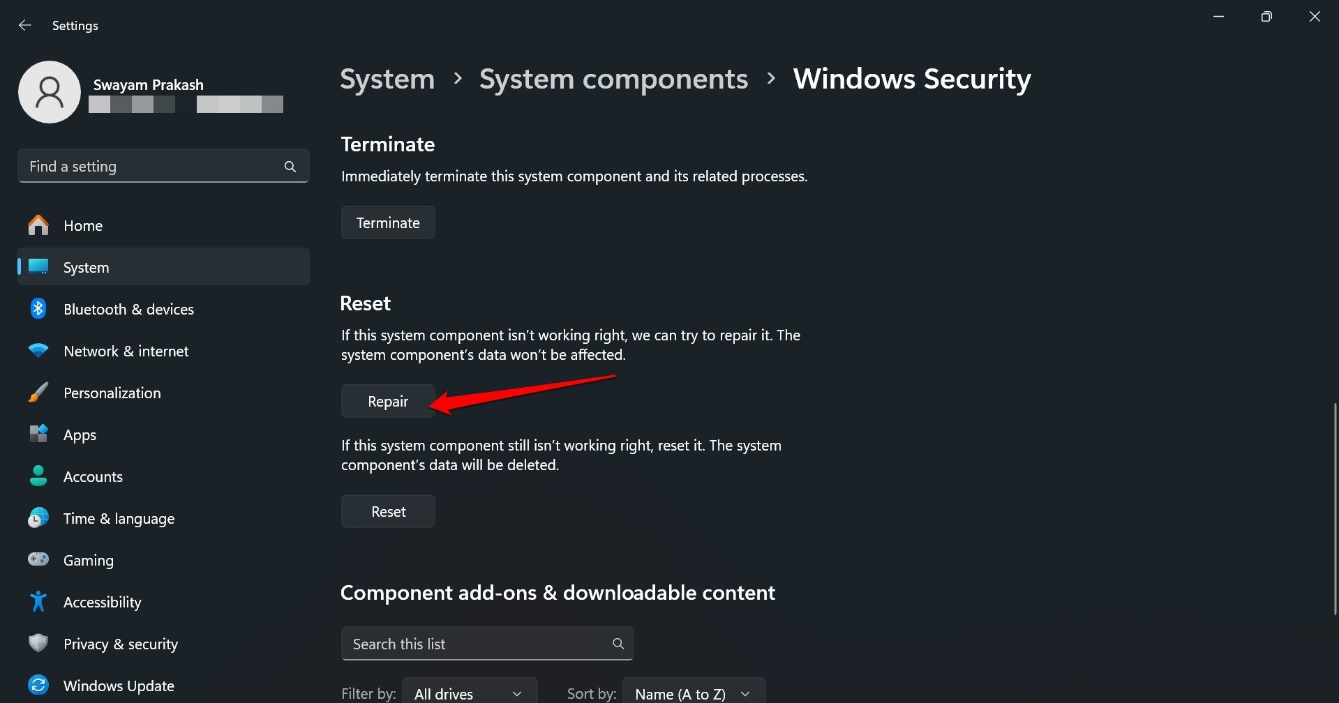 Windows 11 提供了修复和重置 PC 上有问题的系统组件的规定。由于“保护历史记录”属于“Windows 安全中心”,因此可以修复后者以解决问题。