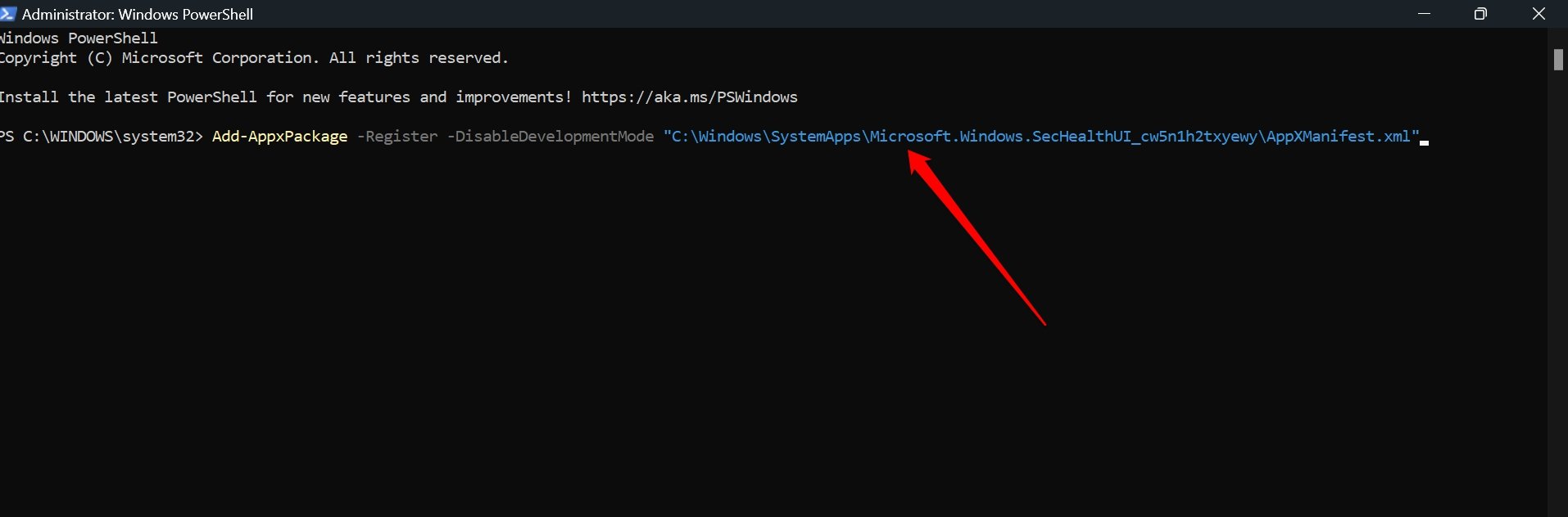 Add-AppxPackage -Register -DisableDevelopmentMode "C:\Windows\SystemApps\Microsoft.Windows.SecHealthUI_cw5n1h2txyewy\AppXManifest.xml"