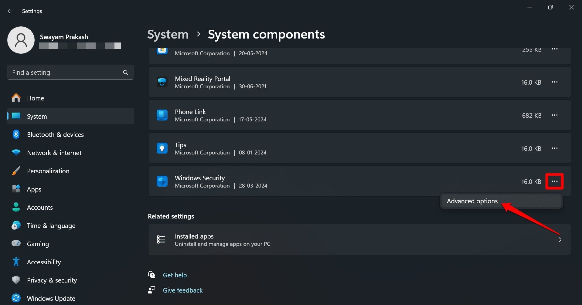 - 滚动到“Windows 安全中心”,然后单击其旁边的溢出图标。