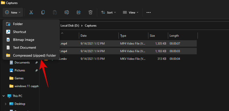 现在单击“新建”并选择“压缩(zipped)文件夹”。