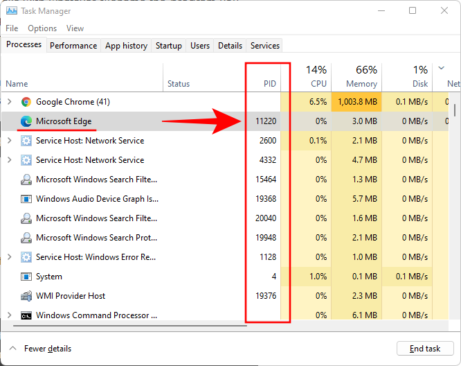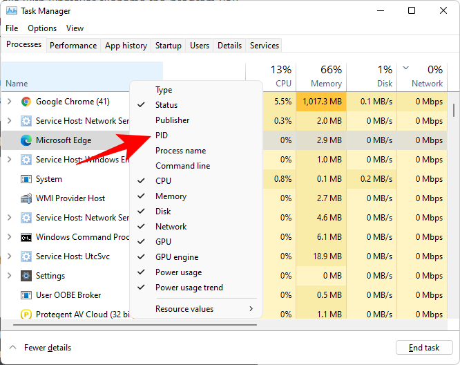 启动任务管理器(如前所示),然后选择要查找其 PID 的进程。然后右键单击顶部的排序选项(名称、状态、CPU 等)并选择PID。