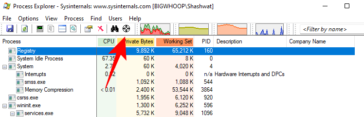 解压缩 zip 文件的内容后,打开 Process Explorer。初始屏幕将显示系统上运行的进程。该列表可能很长。因此,为了简单起见,请在顶部工具栏中找到十字准线图标。