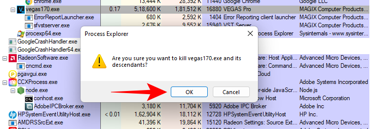 现在将在 Process Explorer 中自动选择该应用程序。右键单击它并选择结束进程树并完全关闭它。