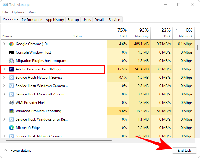 默认情况下,您将位于“进程”选项卡下。在正在运行的进程列表中找到罪魁祸首并选择它。然后点击右下角的结束任务。