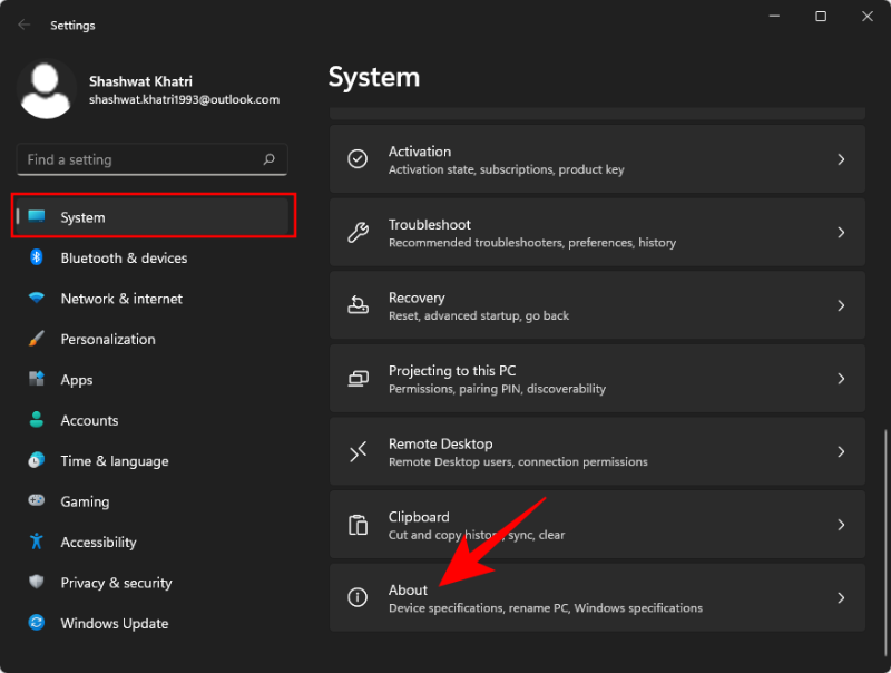 您的计算机名称也可在“关于”部分中找到。要找到它,请一直向下滚动到右侧的底部,然后单击About。