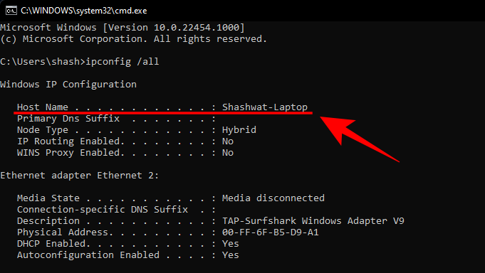 按 Enter。这将返回 IP 配置的所有详细信息,包括顶部的计算机名称(或主机名)。这是它的样子: