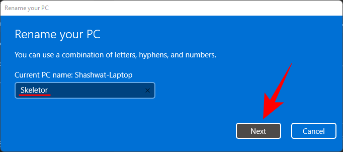 无论您在何处选择该选项,您都会看到相同的“重命名您的 PC”窗口。在这里,您将看到您的“当前 PC 名称”以及其下方的用于键入新名称的字段。为计算机设置新名称后,单击下一步。