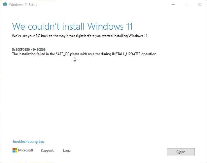 对于某些用户,还会弹出另一条错误消息。这个被称为“0x800F0830 – 0x20003”,它的描述是“安装在 SAFE_OS 阶段失败,在 INSTALL_UPDATES 操作期间出现错误”。