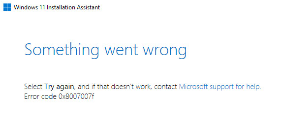 但是,无论您是否运行受支持的系统,任何人都可能发生安装错误。例如,下图显示了错误代码“0x8007007f”,据报告它发生在 71% 安装标记附近。这似乎是在使用安装助手时发生的。