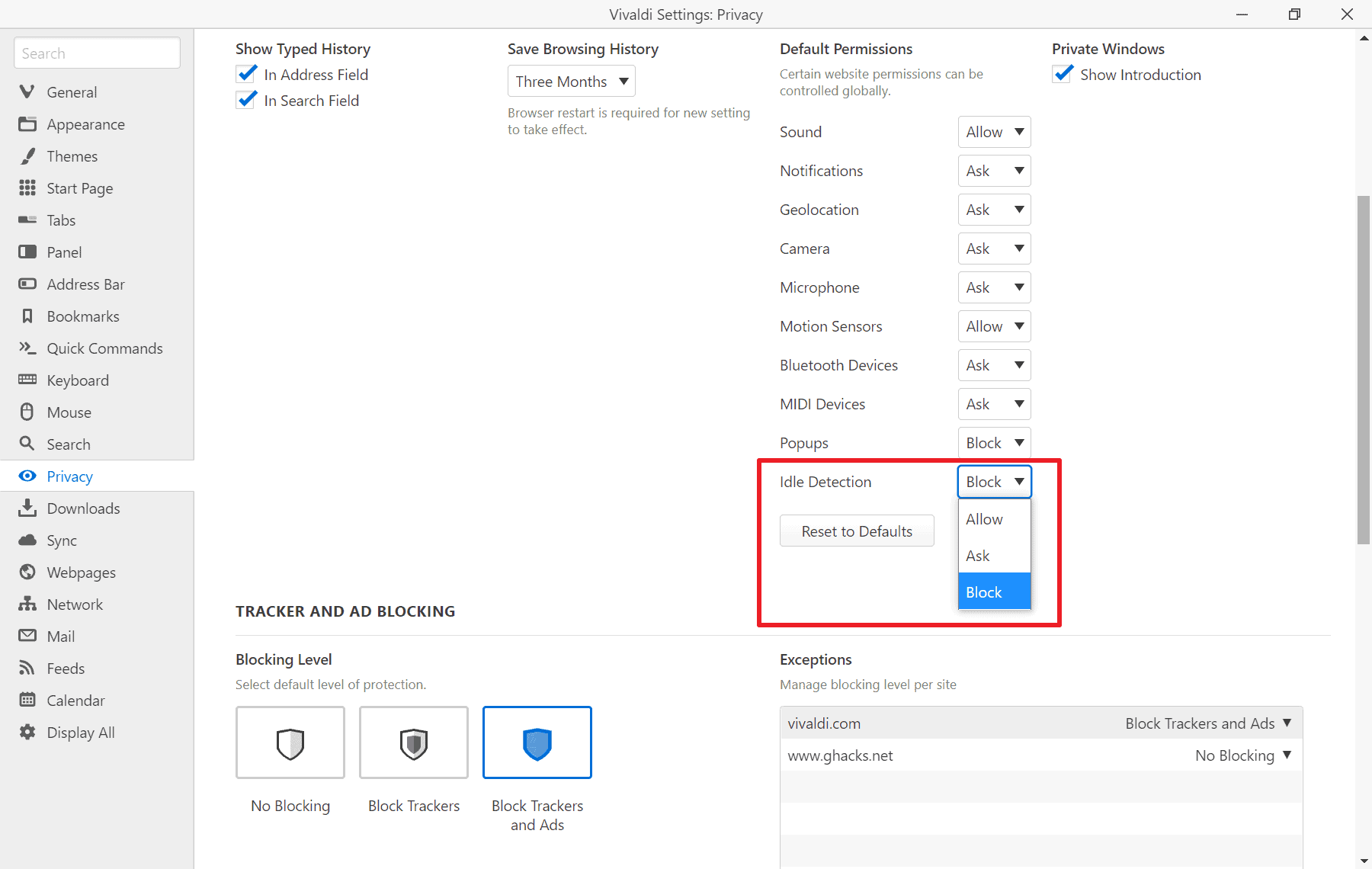 Vivaldi 用户可以通过访问设置 > 隐私,并将空闲检测字段的状态从阻止更改为“询问”或“允许”来启用它。每当站点请求使用空闲检测 API 的权限时,Ask 都会在浏览器中显示提示,允许在没有用户交互的情况下授予它该权限。