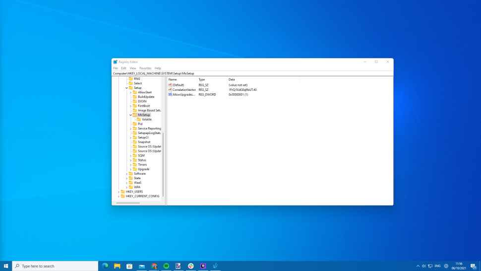 从那里,从顶部栏导航到HKEY_LOCAL_MACHINE\SYSTEM\Setup\MoSetup,然后右键单击主面板,选择create a new DWORD (32-bit) Value。