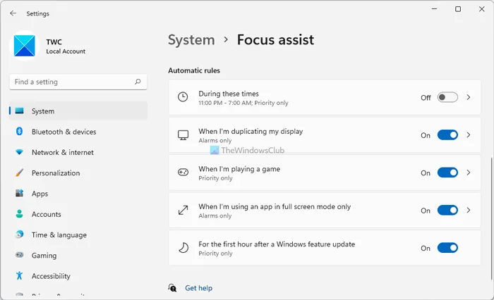 如果您在焦点辅助中设置自动规则,它会自动打开。换句话说,Windows 11 根据自动规则设置自动启用焦点辅助。此处提供了有关自动规则的详细指南,您可以按照此指南阻止它发生。