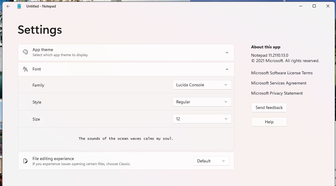 第二个屏幕截图显示了设置页面,其中包含一些有趣的配置。第一个是应用主题,这表明微软可能会为 Windows 11 提供一些个性化选项。第二个是更改文件编辑体验的选项。这表明,记事本不仅仅是重新设计,还可能对文本的呈现方式进行了一些后端修改,因此Microsoft 可能会为用户提供切换到经典体验的选项。