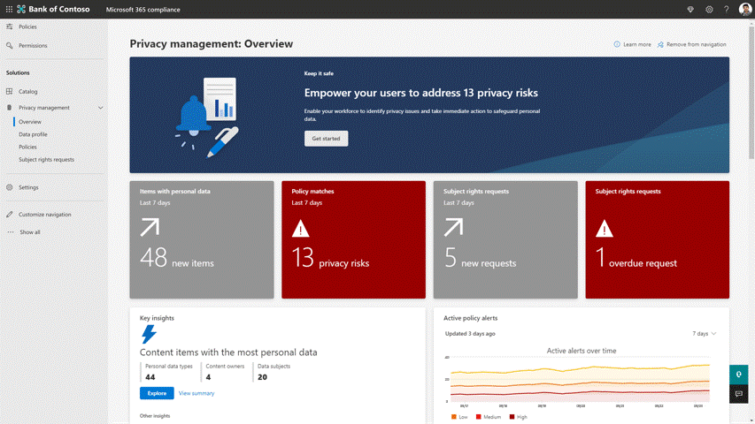 数据传输、最小化、过度暴露和主题权限请求管理等隐私操作可以使用模板自动化。同样,也可以创建自定义策略。它还向 IT 管理员提供有关如何确保数据隐私的建议,并为数据所有者提供有关如何在不牺牲隐私的情况下处理生产力场景中的数据的指导。可以在下面看到显示隐私管理门户的 GIF: