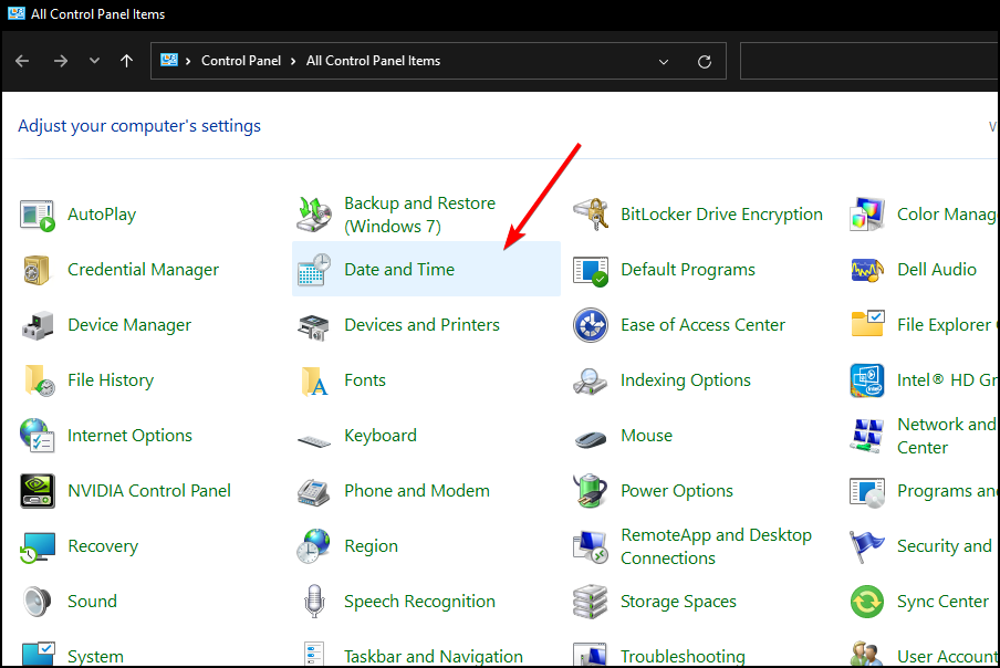 - 在“控制面板”窗口中,从网格中找到并单击“日期和时间”选项。