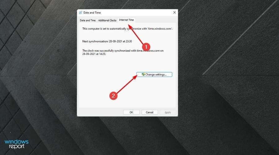 - 接下来,转到Internet 时间选项卡,然后单击窗口上的更改设置按钮。