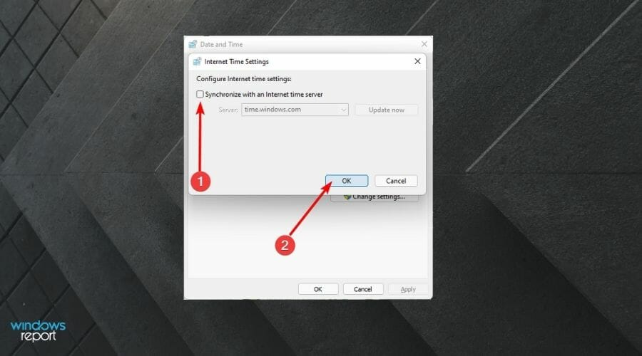 - 现在从叠加窗口,取消同步 同 一个 网络 时间 服务器选项,并单击OK按钮确认并关闭。