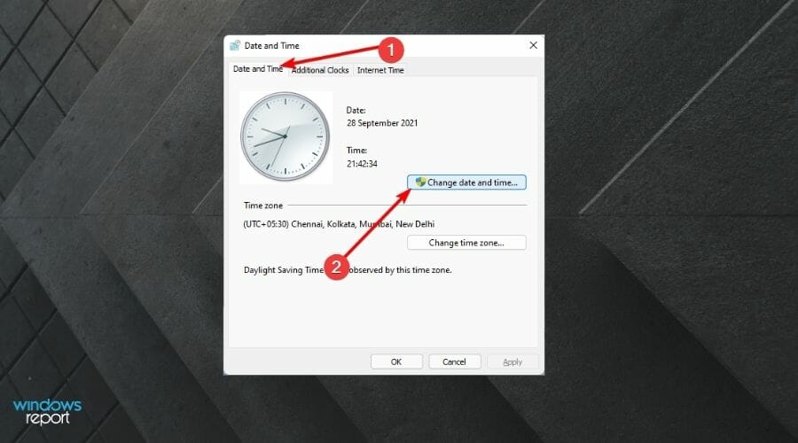 - 然后,前往日期 和 时间选项卡并单击更改日期和时间按钮。
