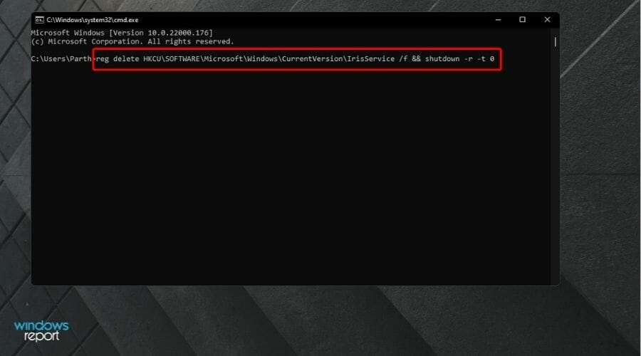 reg delete HKCU\SOFTWARE\Microsoft\Windows\CurrentVersion\IrisService /f && shutdown -r -t 0