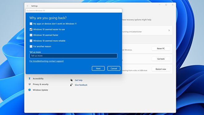 第 3 步:选择返回的原因(或仅选中“出于其他原因”并将该字段留空),然后单击“下一步”。Windows 会尝试说服您检查更新以修复潜在问题,但您只需单击“不,谢谢”继续回滚。