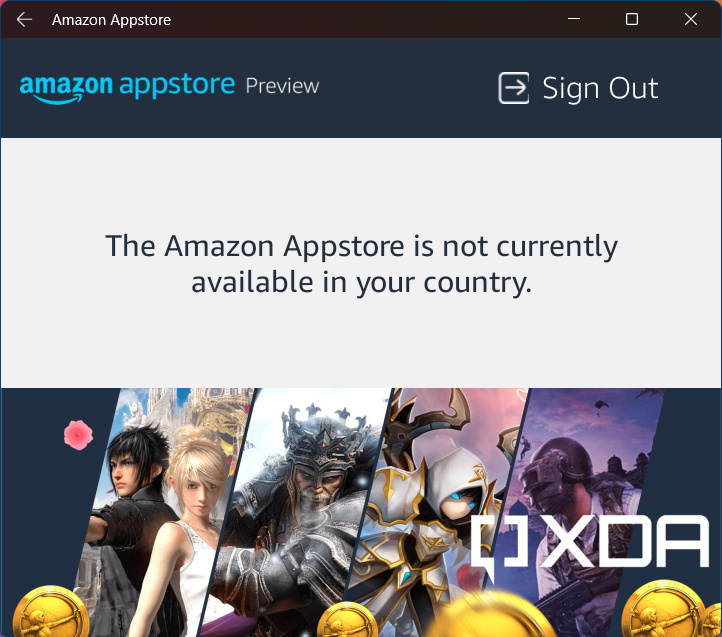一旦您安装了适用于 Android 的 Windows 子系统软件包,您应该会看到 Amazon Appstore 出现在您的“开始”菜单中。该快捷方式指向商店的 Android 应用程序变体,它允许您使用您的 Amazon 帐户凭据登录。但是,在下一步中,将通知非美国用户 Amazon Appstore 在他们的国家/地区不可用。