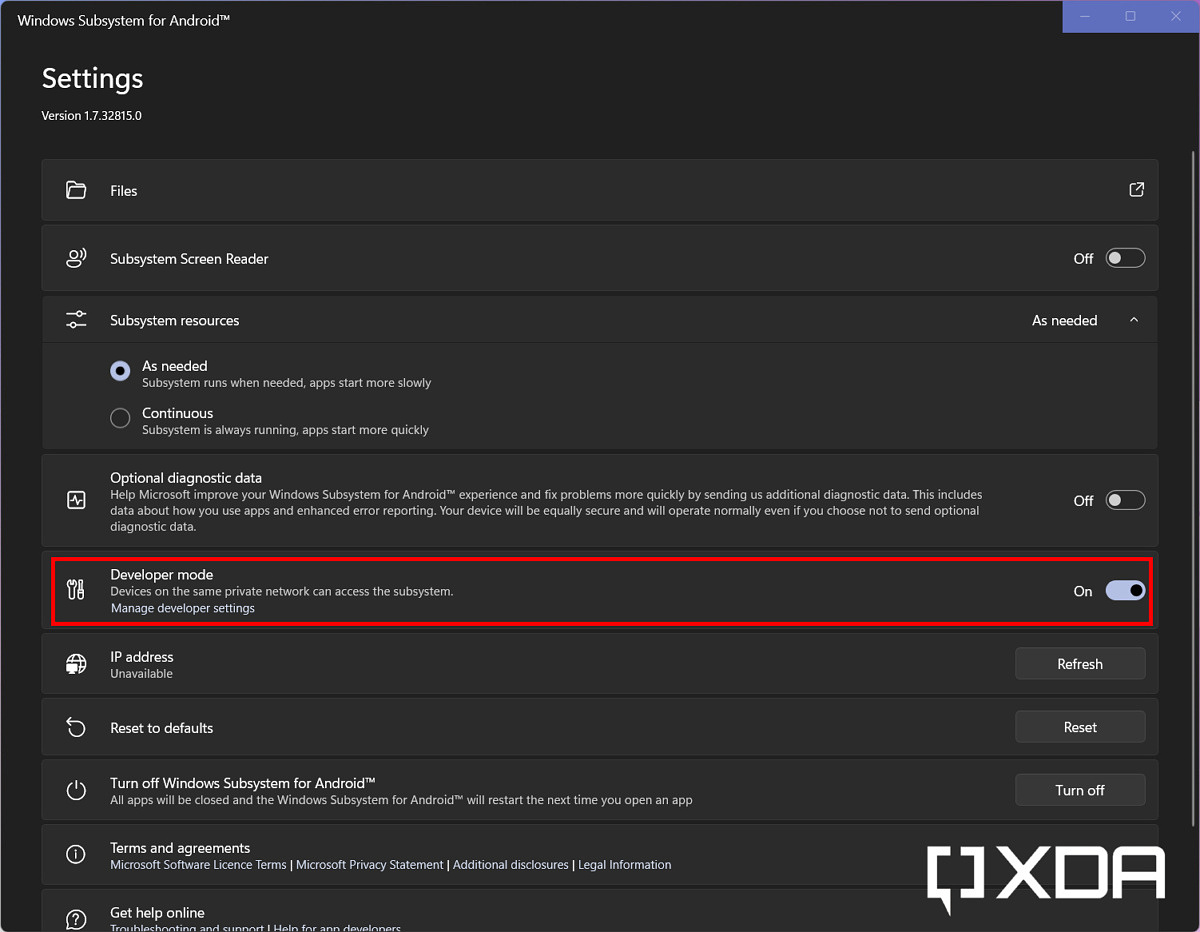 - 此时,您应该会看到适用于 Android 的 Windows 子系统设置屏幕。向下滚动并启用“开发人员模式”切换。