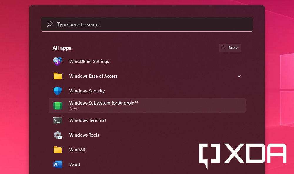 - 掌握 APK 文件后,启动适用于 Android 环境的 Windows 子系统。单击开始菜单,然后单击“所有应用程序”按钮,然后找到名为“Windows Subsystem for Android™️”的快捷方式。您还可以在搜索框中键入“子系统”以使其更快。
