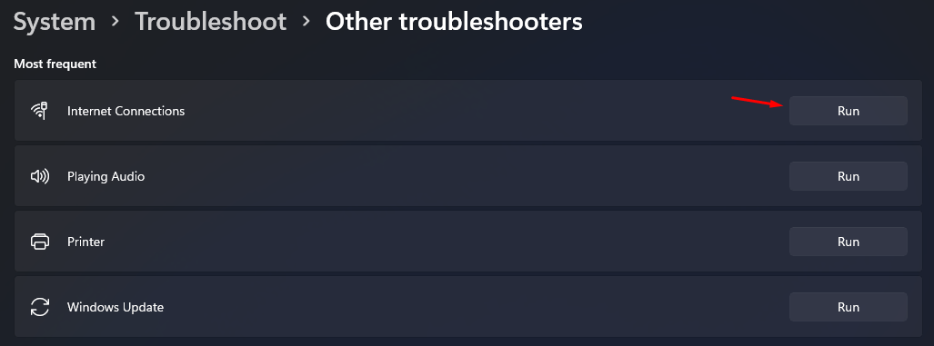 - 找到“ Internet 连接”,然后单击“运行”以扫描网络是否存在问题。