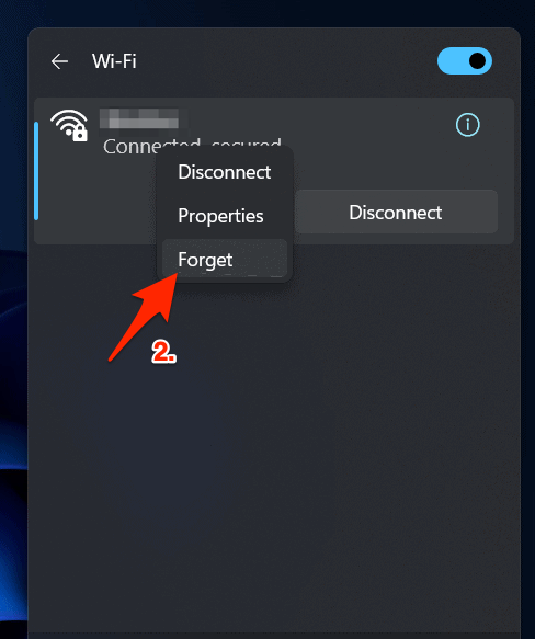Wi-Fi 路由器或热点与机器中的无线模块之间发生通信错误。如果这是问题所在,只需通过忘记网络并重新连接到同一网络来擦除 Windows 配置。您必须输入无线网络密码,因此请务必事先记下。