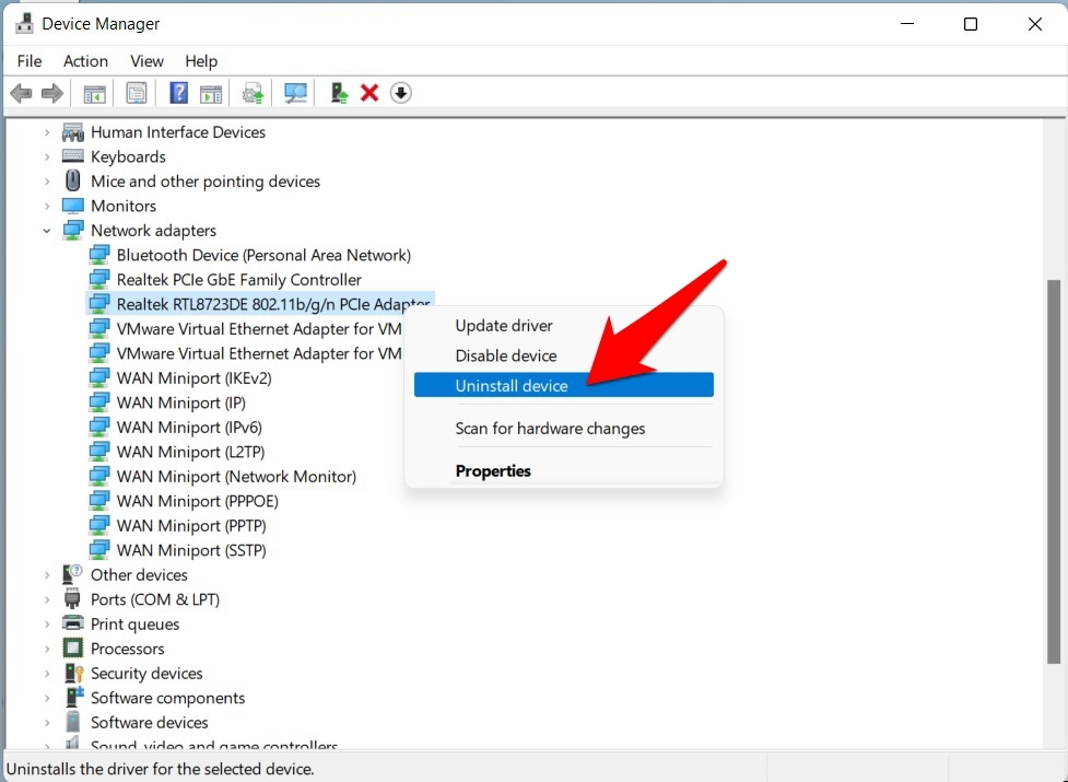- 右键单击您的 网络驱动程序 并选择 Uninstall Device。