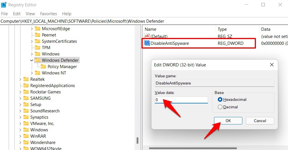- 将此文件命名为 DisableAntiSpyware。然后双击打开它并在数值数据字段下输入 0。