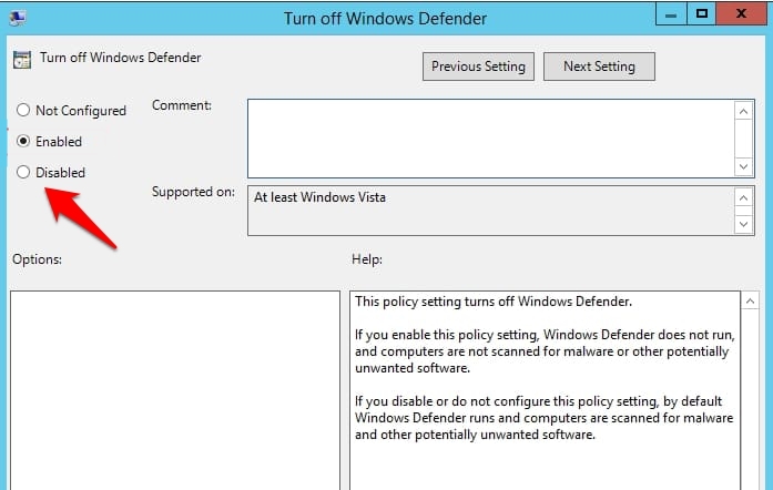 在某些情况下,一旦您安装了某个 Windows 质量更新,它可能最终会启用“关闭 Windows Defender”策略。所以你应该考虑尽早禁用它,可以按如下方式完成: