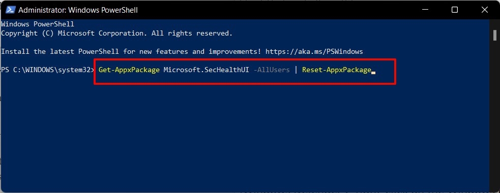Get-AppxPackage Microsoft.SecHealthUI -AllUsers | 重置-AppxPackage